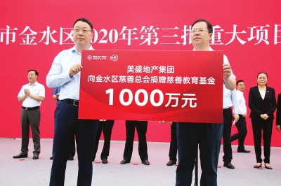 開工儀式現場美盛地產集團常務副總裁徐建民先生,代表美盛地產集團向金水區慈善總會捐贈1000萬元教育基金,由金水區民政局局長劉楠同志上臺接受捐贈。