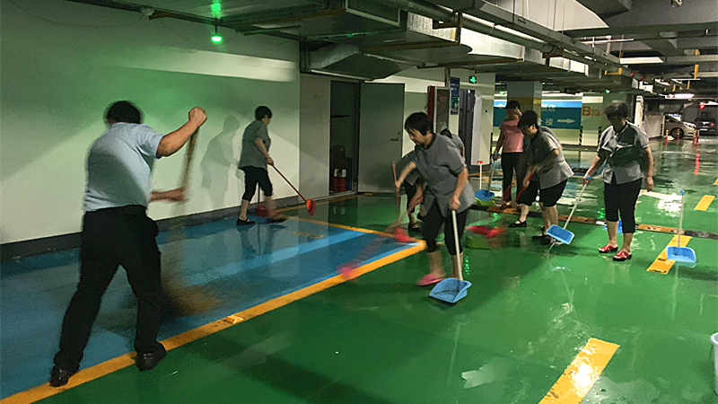 在雨水絲毫不減,越下越急的危機時刻,工程部師傅們毅然踏入水中,一點一點清理被堵的排水口,盡全力保障業(yè)主家園安全。平均年齡比其他各部門都高的環(huán)境部工作人員,絲毫沒拖任何后腿,全力向前,爭分奪秒地不間斷補位吸水排污,順利完成美盛中心地下三層車庫無積水出現任務。