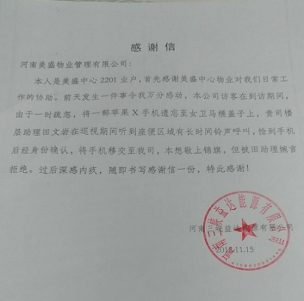 一封來自美盛中心入駐業戶的感謝信,信中寫到樓層助理田文巖撿到手機后歸還業戶,業戶欲送錦旗被拒絕,發來感謝信。對于我們來說,拾金不昧、助人為樂是最基本的工作道德,是應該做的,無需多言。
