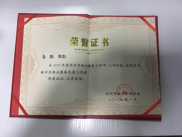2019年1月22日,鄭州市物業管理協會第五屆第四次會員大會在鄭州隆重召開,會上對2018年度優秀企業和個人進行表彰。河南美盛物業管理有限公司鄭州分公司獲得“2018年度鄭州市物業服務先進企業”榮譽稱號;美盛中心項目客服部經理馬聰同志獲得“2018年度鄭州市物業服務先進工作者”榮譽稱號。