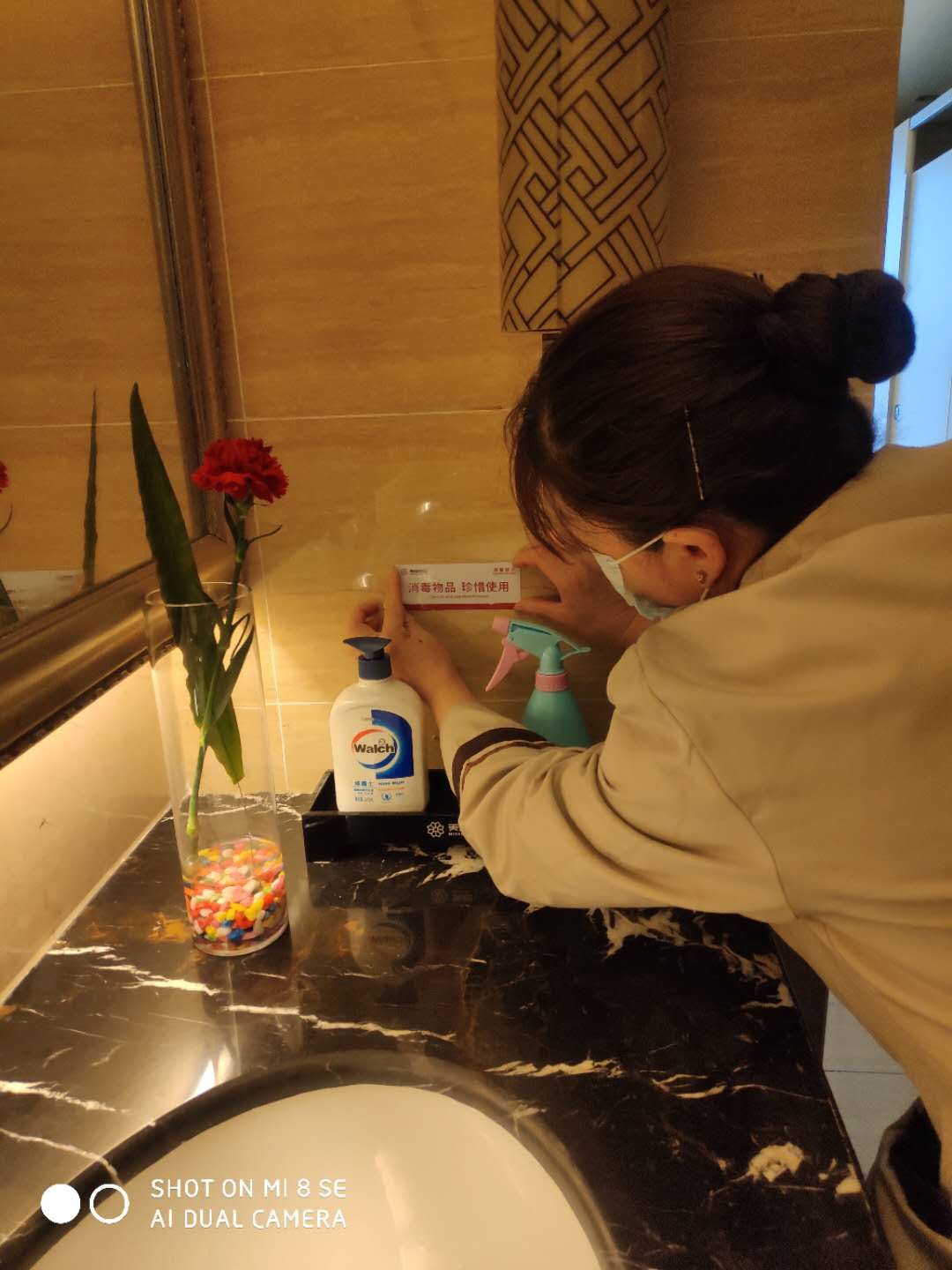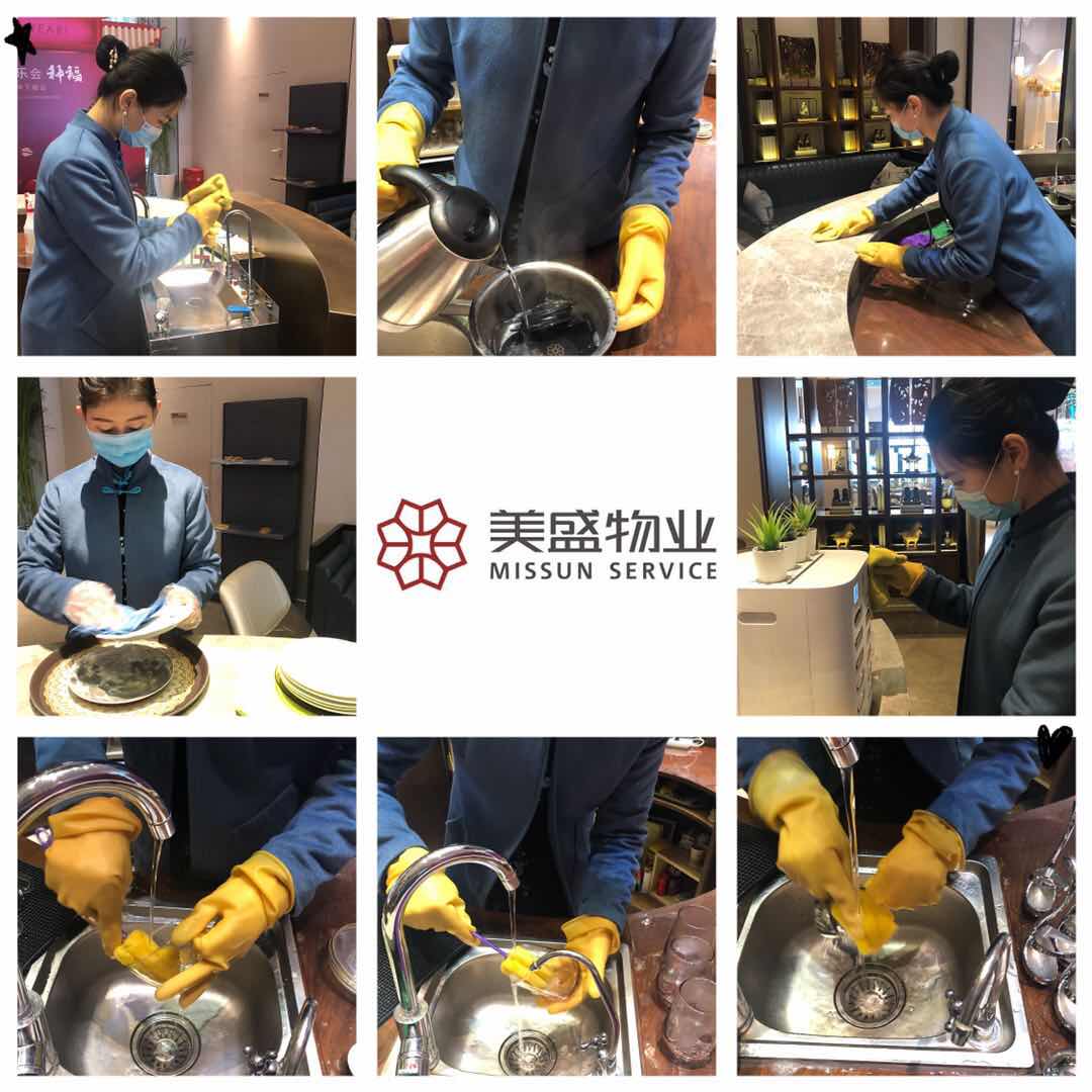 案場水吧臺、接待區物品進行全面清潔、消毒;樣板間、衛生間全面消毒擦拭、地毯清潔。