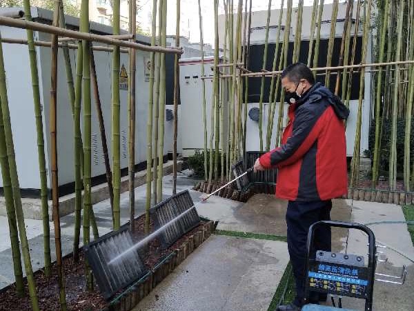 各項目整改公共區域環境消毒計劃,綠化帶、喬灌木進行全面澆水、施藥;園區、案場、商業、寫字樓外圍地面、車棚沖刷清洗,垃圾桶、垃圾站全面清潔消毒;對工程部倉庫進行材料規整,清除廢舊物品,物品上架擺放整齊。