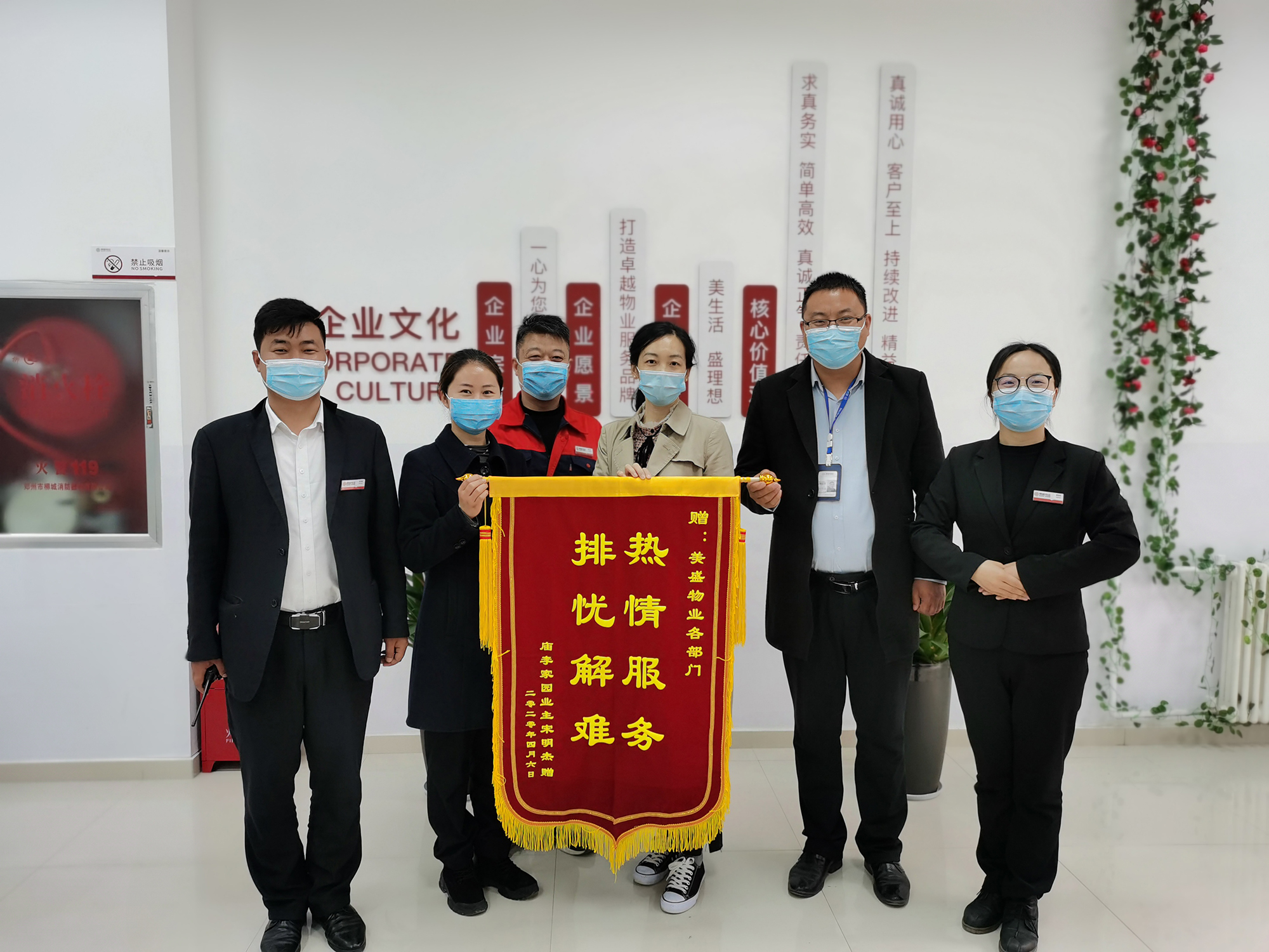 4月8日下午,這位年輕的女業(yè)主,便帶著一面錦旗再一次走進(jìn)了廟李家園東苑的服務(wù)大廳,這次卻帶著對(duì)工程董師傅誤會(huì)的歉意和對(duì)物業(yè)中心熱情服務(wù)的感謝,并和大家合照留念。