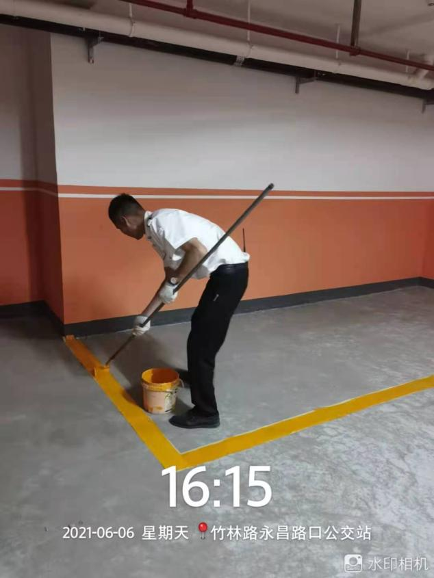 悅府小區(qū)高層負(fù)一層作為非機(jī)動(dòng)車停放區(qū),地面未設(shè)置停車標(biāo)線,在項(xiàng)目確定要在負(fù)一層設(shè)置停車標(biāo)線之后,王志輝主動(dòng)請(qǐng)纓,承擔(dān)起負(fù)一層標(biāo)線的劃設(shè)工作,他利用班余時(shí)間,對(duì)負(fù)一層停放區(qū)域規(guī)劃、地面清理、調(diào)漆、劃線等,在他的帶領(lǐng)下,負(fù)一層停放區(qū)域劃線圓滿完成,并取得良好的效果。
