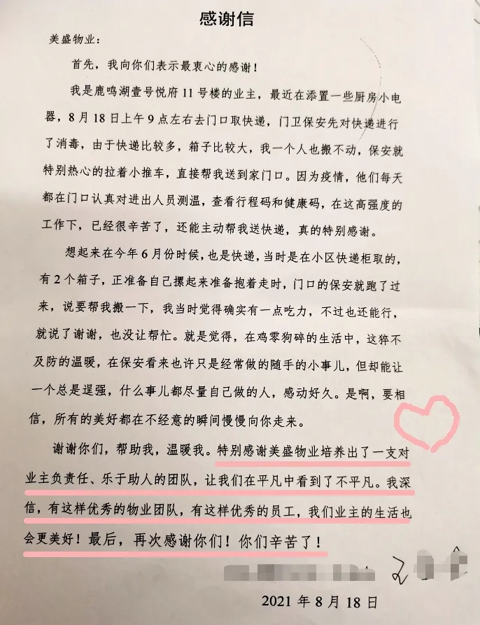 “在雞零狗碎的生活中,這猝不及防的溫暖,在保安看來也許只是隨手的小事兒,但卻能……感動好久。是啊,要相信,所有的美好都在不經(jīng)意的瞬間慢慢向你走來!”一封情真意切的感謝信,是對我們工作最大的肯定,也正是因為有了我們廣大業(yè)主的支持和配合,才會有我們小區(qū)的美好生活!