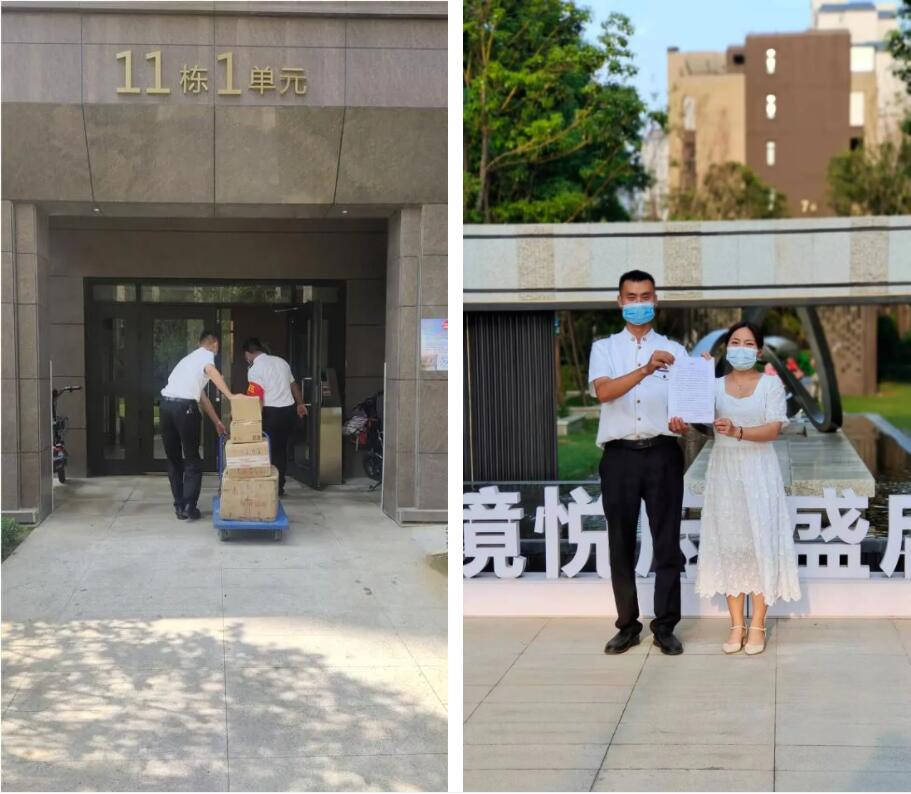 在8月18日這一天,鹿鳴湖壹號悅府小區(qū)有一位女士業(yè)主,因快遞太多,在帶著快遞到達(dá)小區(qū)西門后,小區(qū)的秩序領(lǐng)班王志輝和隊員王博正在門口執(zhí)行卡點(diǎn)任務(wù)。在看到業(yè)主帶的快遞后,主動幫助業(yè)主進(jìn)行快遞的消殺。同時他們立即取來小區(qū)的便民服務(wù)車,將業(yè)主的快遞放置在車上,一直幫業(yè)主送到門口。